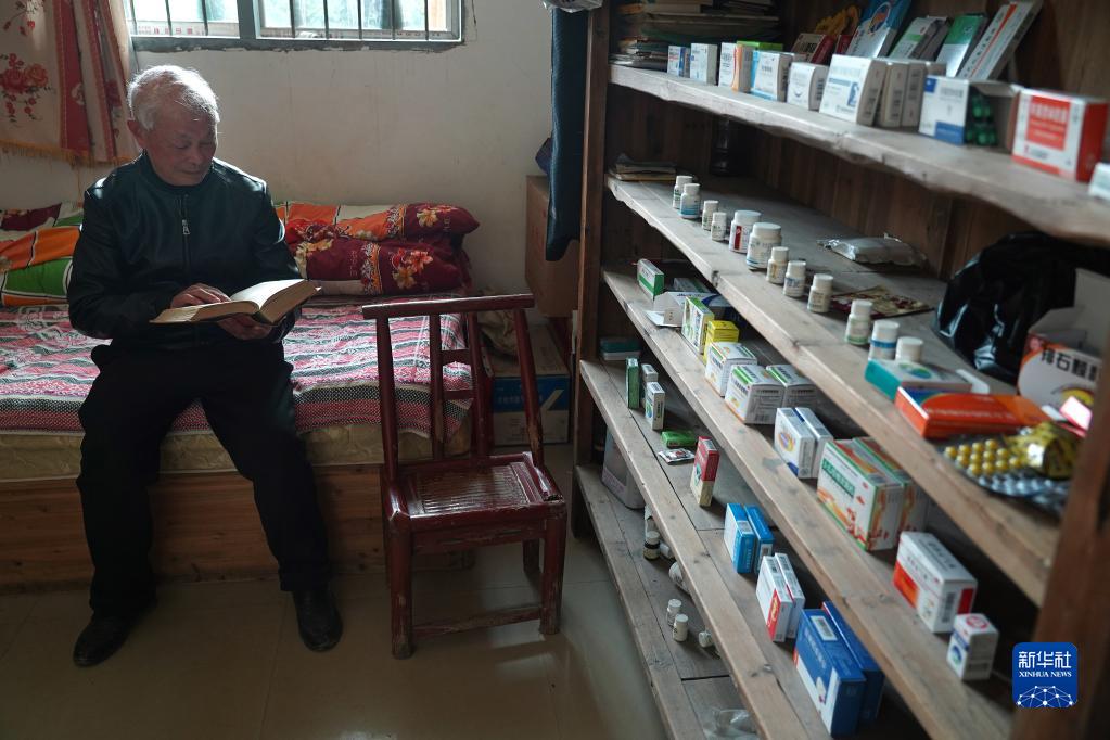在江西省豐城市鐵路鎮楊坊村,村醫徐秋生在家中看書。他床邊的架子上擺滿了藥品,以便出急診時隨時取用(1月10日攝)。