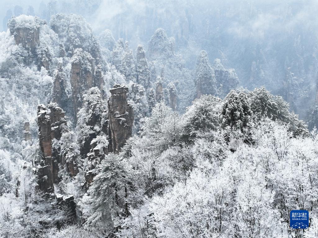 當(dāng)日,位于湖南張家界的天子山被冰雪覆蓋,峰林銀裝素裹,美如畫卷。