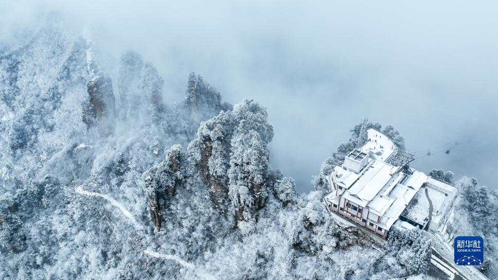 當日,位于湖南張家界的天子山被冰雪覆蓋,峰林銀裝素裹,美如畫卷。