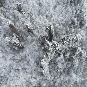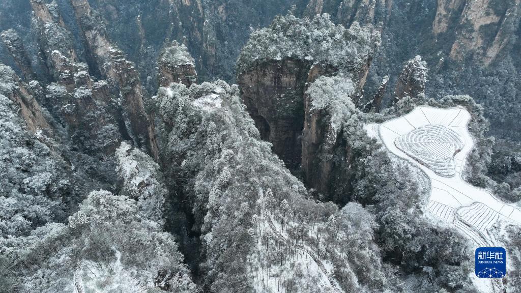 當(dāng)日,位于湖南張家界的天子山被冰雪覆蓋,峰林銀裝素裹,美如畫卷。