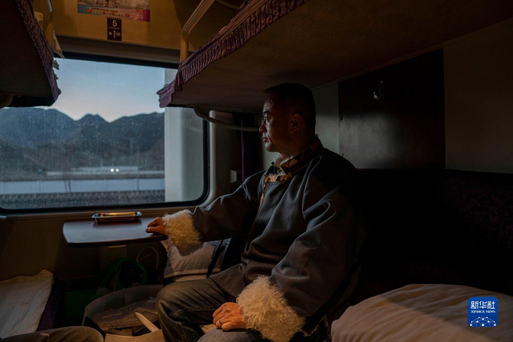在拉薩火車站,黃起崗等待回家的火車發車(1月16日攝)。