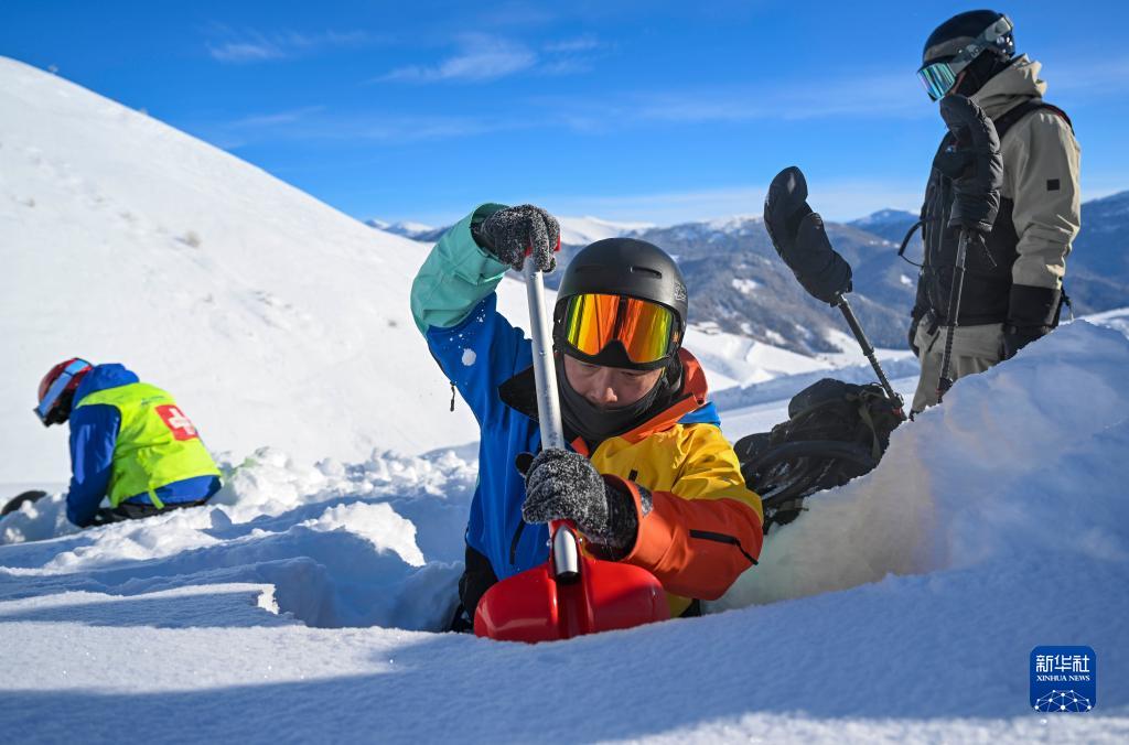 旅居禾木村的雪友彭超(中)和新疆阿勒泰地區禾木吉克普林滑雪場救援隊一起做雪層分析,預判風險保障游客滑行安全(1月13日攝)。