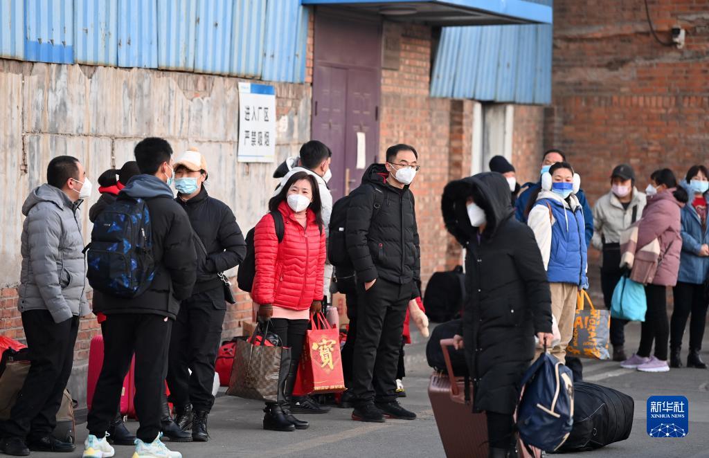1月16日,返鄉工人在天津市北辰區宜興埠鎮等待車輛到達。