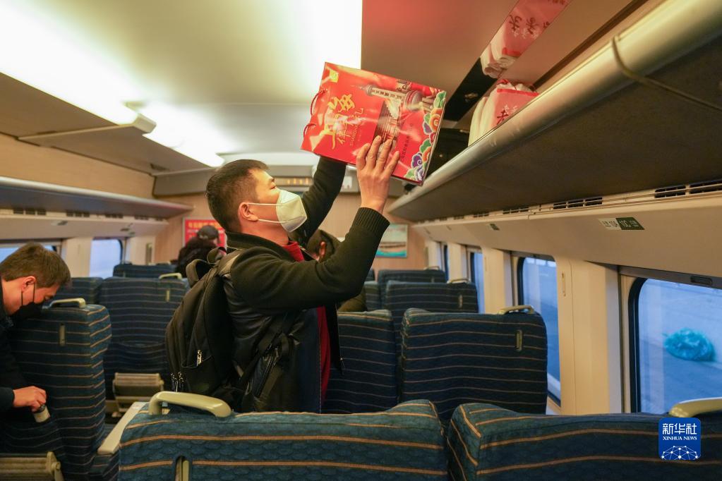 1月15日,在上海南站,易生軍將行李放置在列車行李架上。