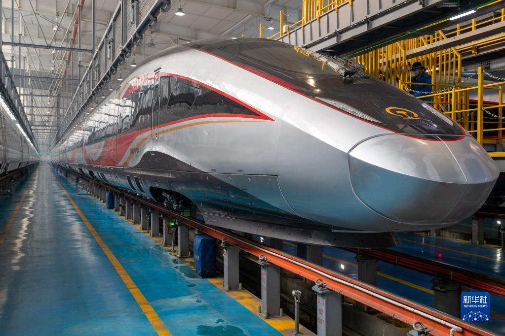 這是停靠在中國鐵路哈爾濱局集團有限公司哈爾濱動車段檢修車間內的CR400BF-GZ型復興號高寒智能動車組(1月16日攝)。