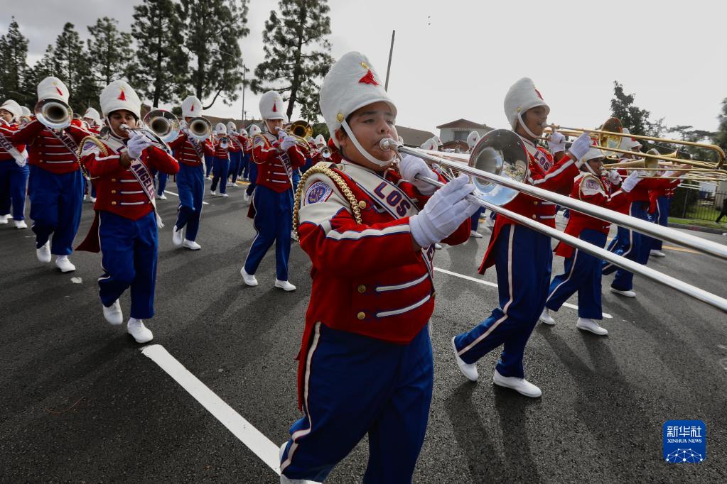 1月16日,在美國洛杉磯,學(xué)生參加馬丁·路德·金紀念日游行時吹奏樂器。