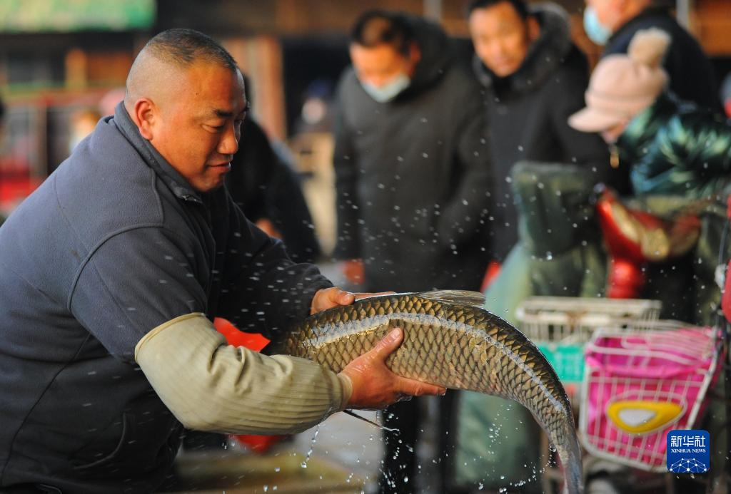 1月17日,在山東省滕州市西崗鎮年集上,一名攤主售賣鮮魚。