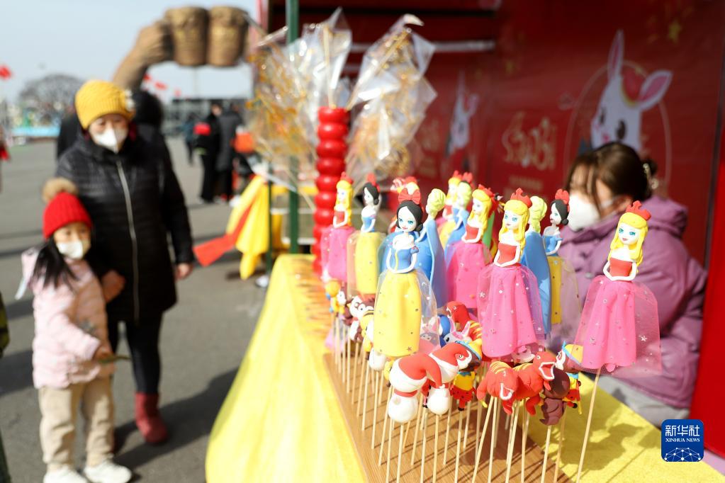1月17日,市民帶著孩子在山東省青島西海岸新區一處集市選購泥人面塑。