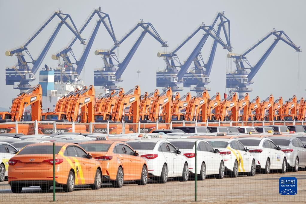 1月17日,在山東港口煙臺港,起重機為貨輪裝卸貨物。