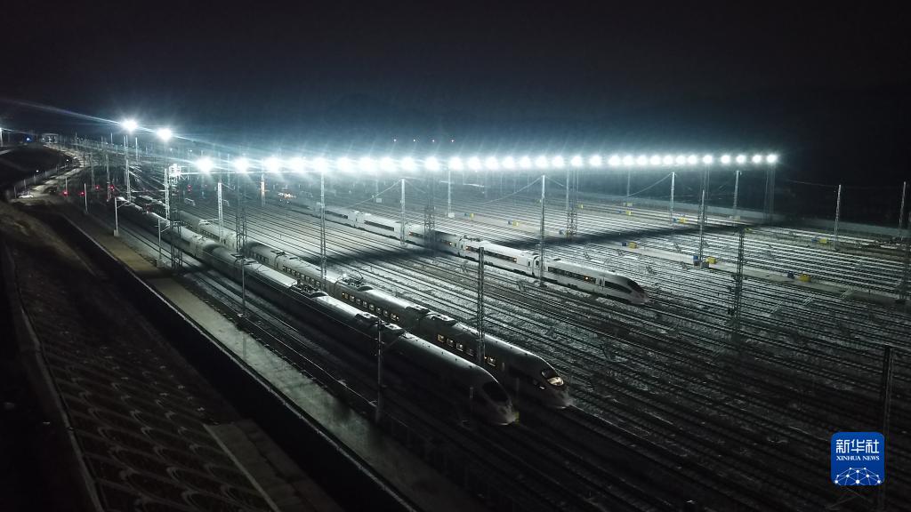 1月17日,列車準(zhǔn)備進(jìn)入長(zhǎng)沙西動(dòng)車運(yùn)用所(無(wú)人機(jī)照片)。