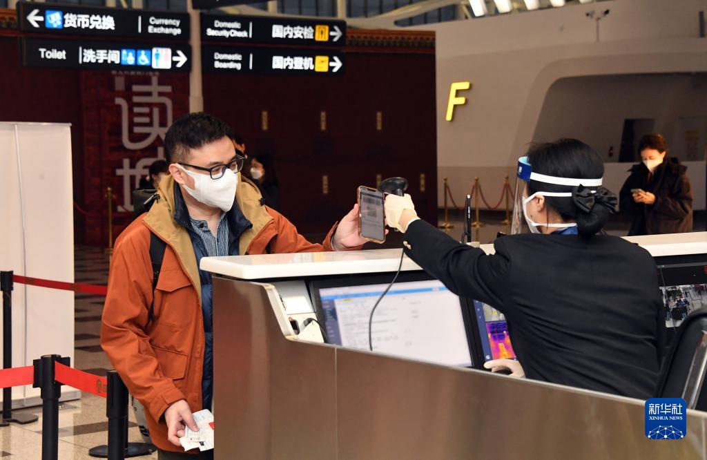 1月17日,在北京大興機場,海關關員核驗乘坐CZ309次北京飛往香港航班旅客的海關健康申報二維碼。