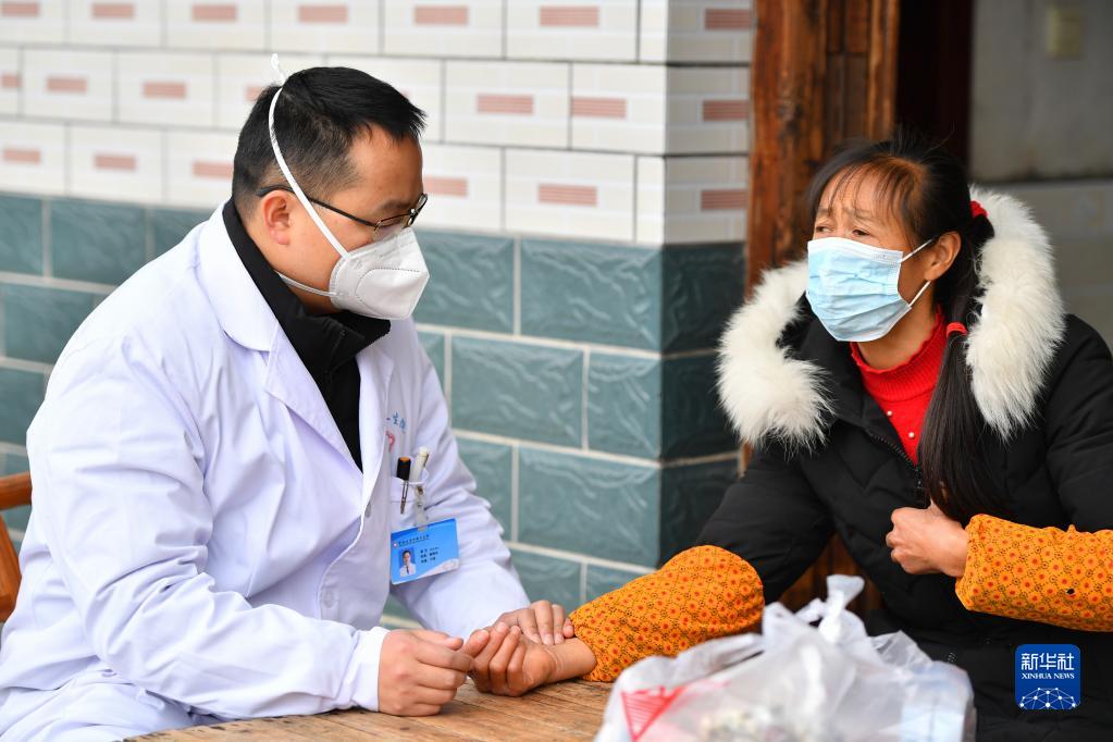 1月17日,在長沙市望城區喬口鎮盤龍嶺村,醫護人員為有不適癥狀的村民把脈。