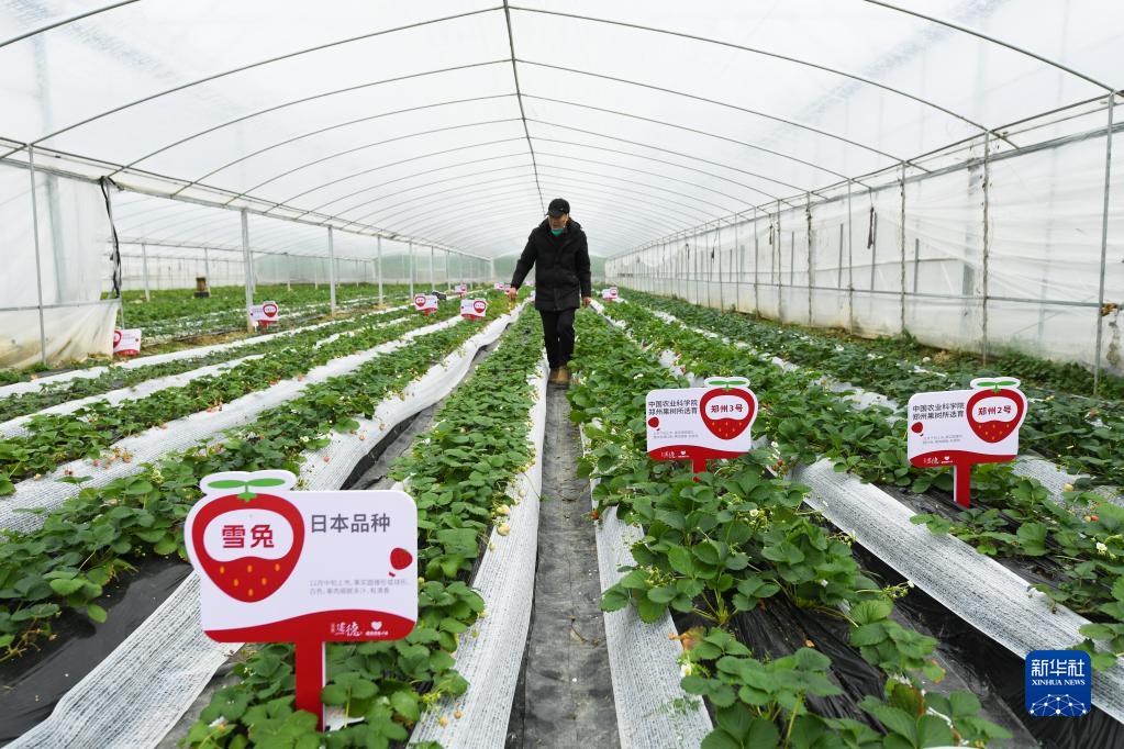 1月17日,浙江省建德市楊村橋鎮草莓種植大戶吳東良在大棚內查看引進的新品種草莓苗。