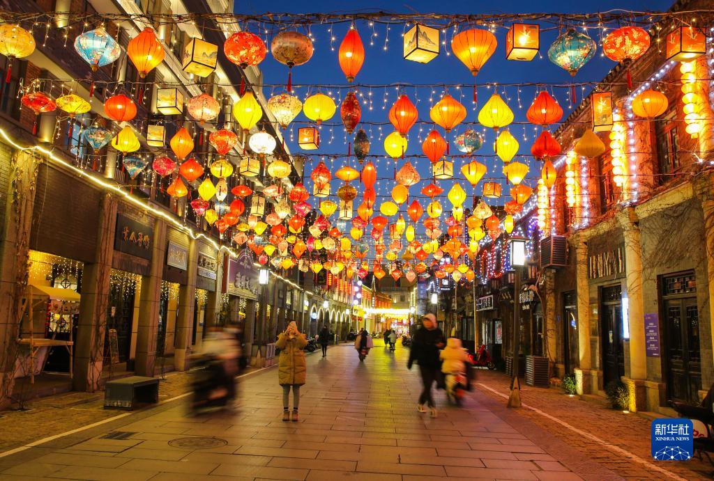 1月16日,江蘇連云港市民主路老街,流光溢彩的花燈點亮了老街小巷夜色。