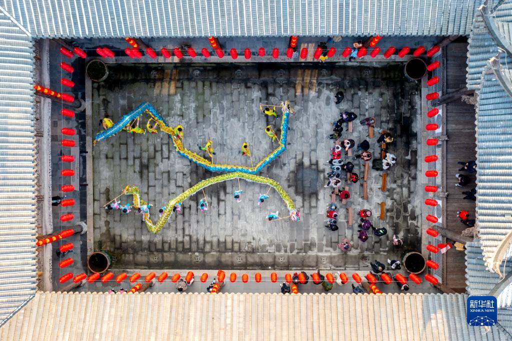 1月17日,在浙江省湖州市長興縣李家巷鎮石泉村文化禮堂內,村民在欣賞非遺節目——鴛鴦龍(無人機照片)。