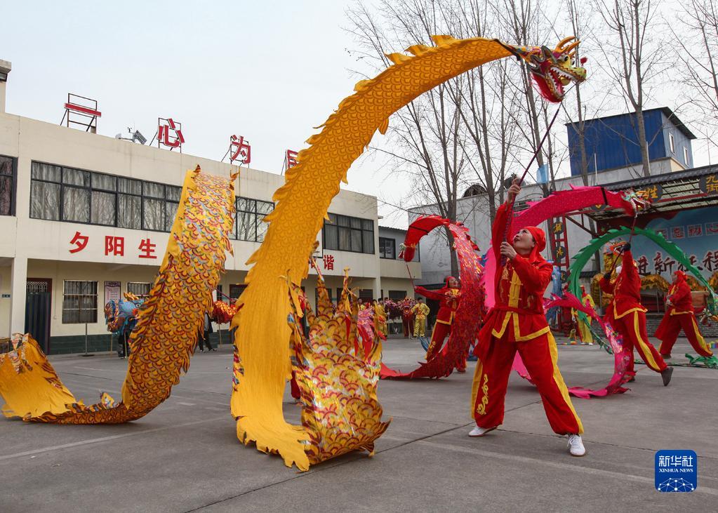 1月16日,在河南省焦作市博愛縣鴻昌街道九街社區(qū),博愛空竹舞龍藝術(shù)團(tuán)的隊(duì)員們在表演。