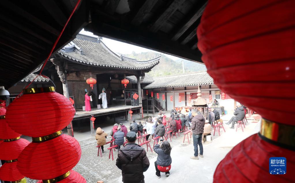 1月17日,浙江省湖州市德清縣舞陽街道山民村村民在觀看戲曲節目。