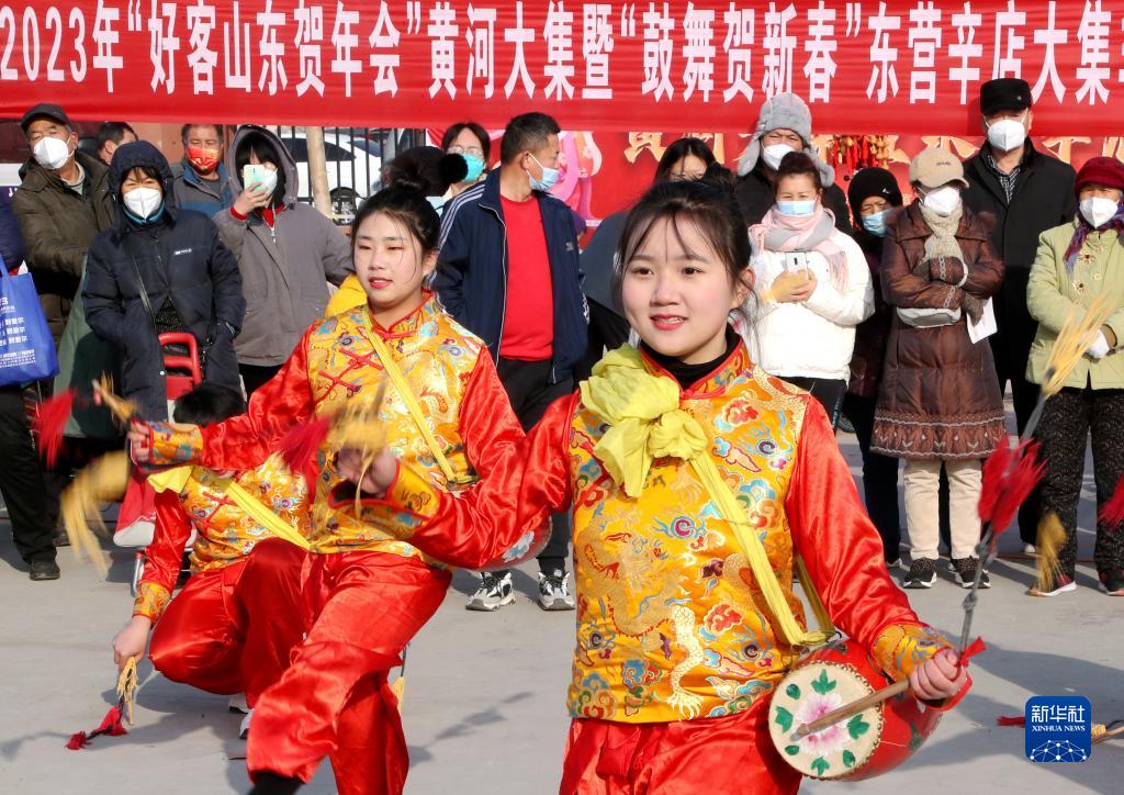 1月17日,在山東省東營市東營區辛店街道辛店大集,人們表演短穗花鼓。