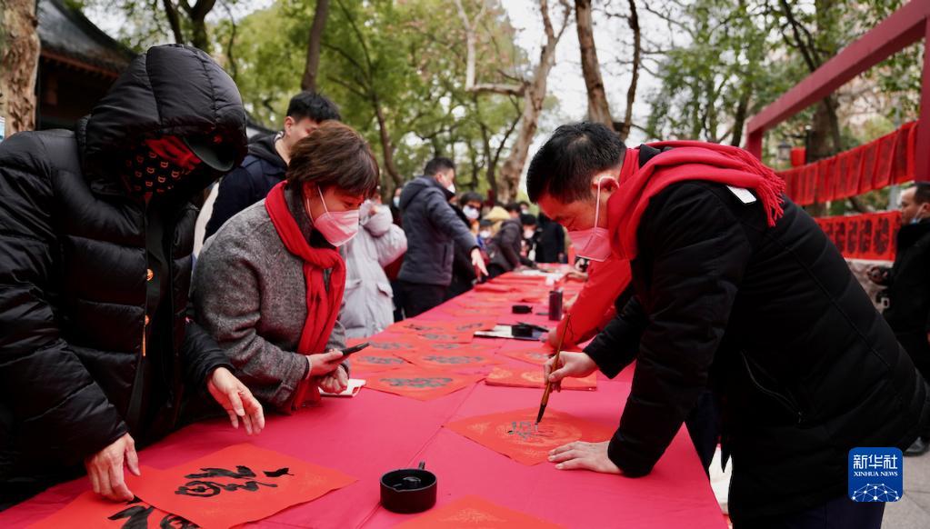 1月17日,書法愛好者在南昌市百花洲八一公園的“迎新春 送祝福”活動上為市民寫福字。