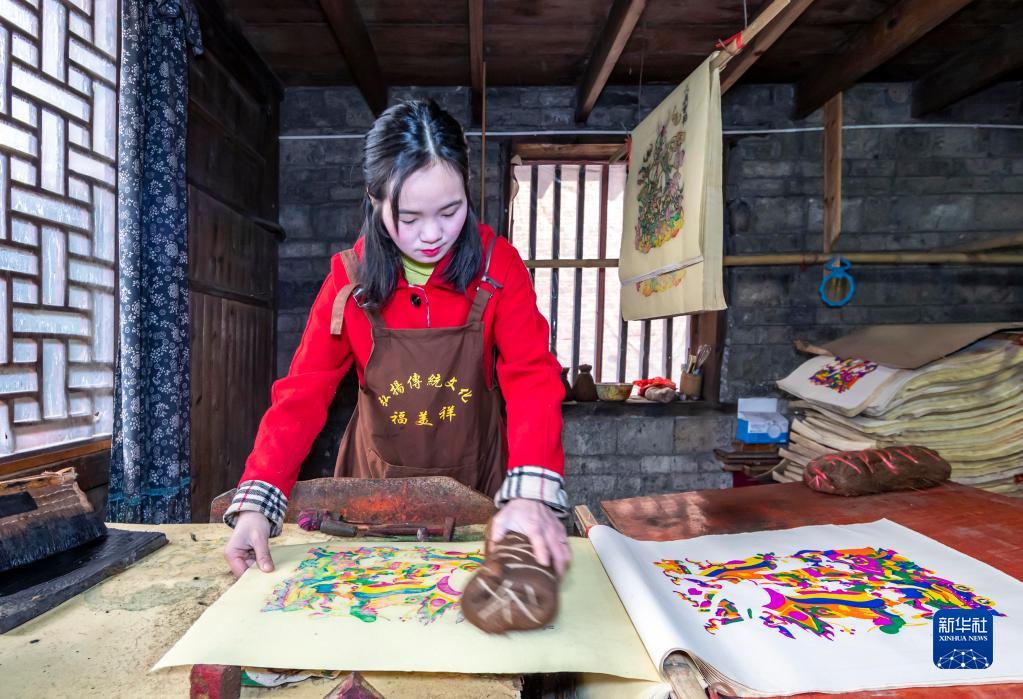 春節臨近,湖南省邵陽市隆回縣灘頭鎮的木版年畫作坊加班加點趕制年畫,供應春節市場。