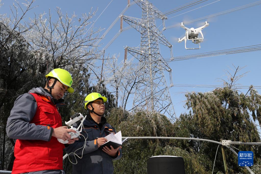 1月16日,在銅陵市義安區天門鎮,國網安徽省電力公司運維人員操作無人機觀測輸電線路覆冰情況。
