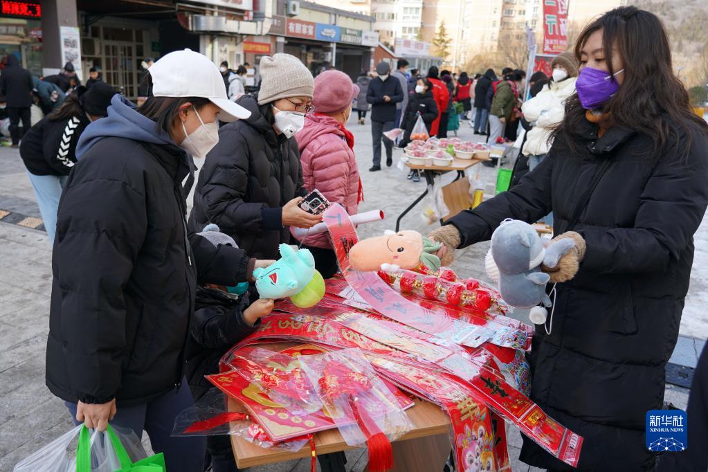1月17日,在濟南市舜雅社區(qū)年貨大集上,居民在挑選對聯(lián)。