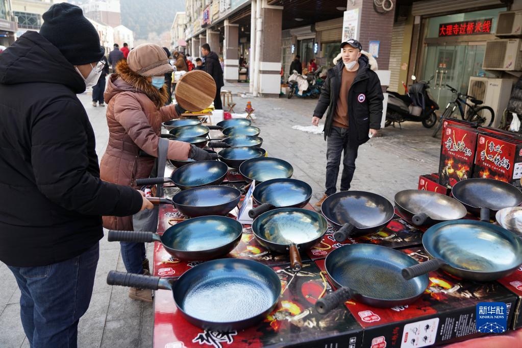 1月17日,在濟南市舜雅社區年貨大集上,居民在選購鐵鍋。