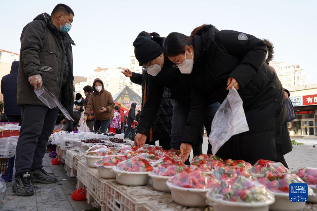 1月17日,在濟(jì)南市舜雅社區(qū)年貨大集上,居民在選購草莓。