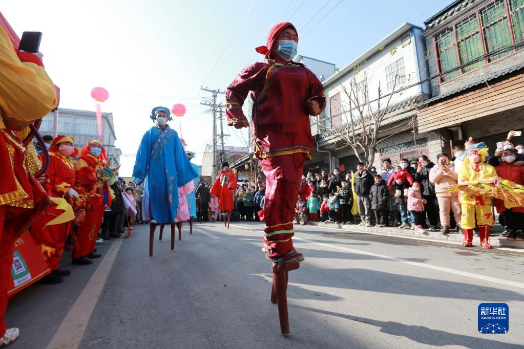 1月17日,在濉溪縣臨渙鎮(zhèn),民俗藝人在表演踩高蹺。