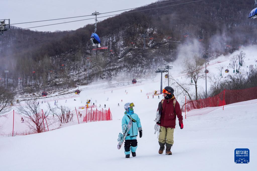 都軒銘(左)和父親都宇走在吉林市萬科松花湖度假區滑雪場內(2023年1月14日攝)。