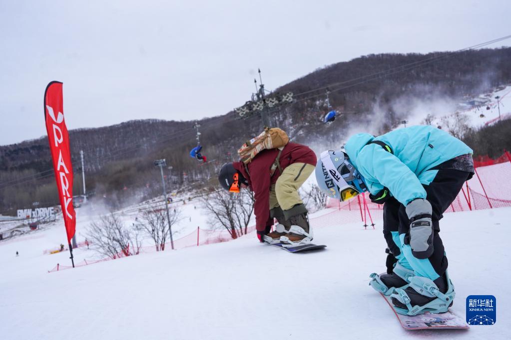 都軒銘(右)和父親都宇在吉林市萬科松花湖度假區V-PARK地形公園準備滑雪(2023年1月14日攝)。