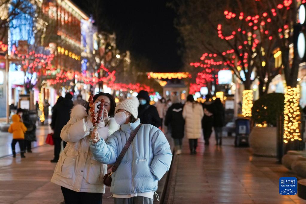 游客在懸掛春節燈飾景觀的前門步行街休閑(1月15日攝)。