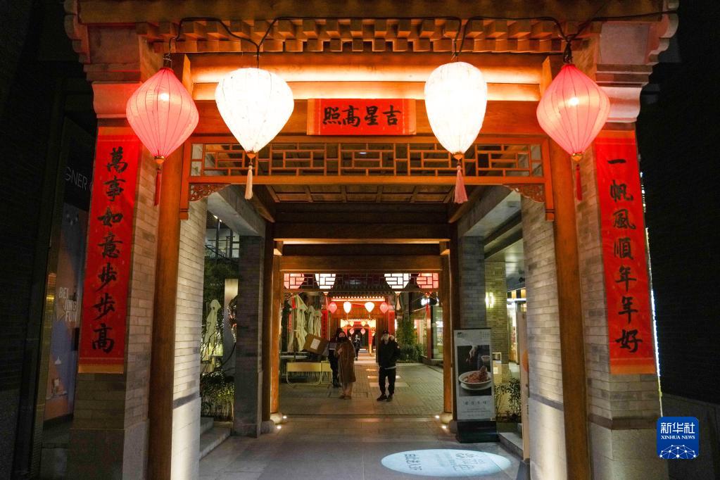 游客在懸掛春節燈飾的北京坊商業區參觀游玩(1月15日攝)。