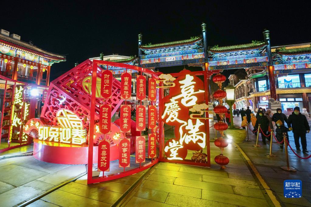 游客在前門步行街的“卯兔迎春”景觀小品旁行走(1月15日攝)。