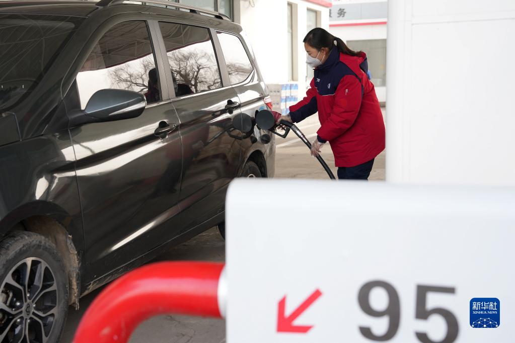 1月17日,河北省邢臺市任澤區一加油站工作人員給汽車加油。