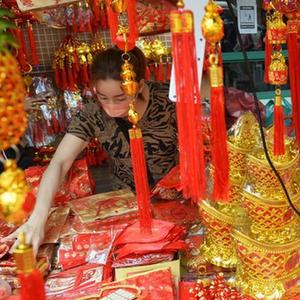 1月16日,一名商販在泰國曼谷唐人街的攤位上擺放春節飾品。