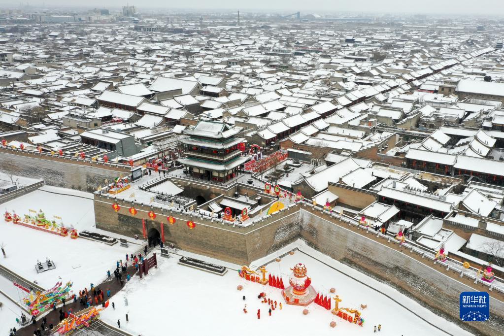 1月14日拍攝的山西平遙古城雪景(無人機照片)。