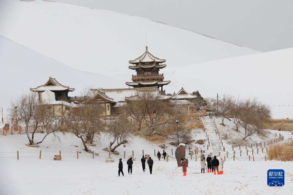 1月13日,游客在甘肅省敦煌市鳴沙山月牙泉景區(qū)賞雪游玩。