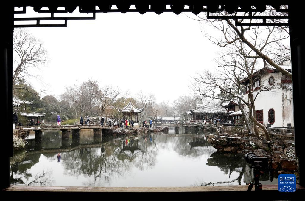 1月15日,游客在江蘇蘇州拙政園觀賞雪景。