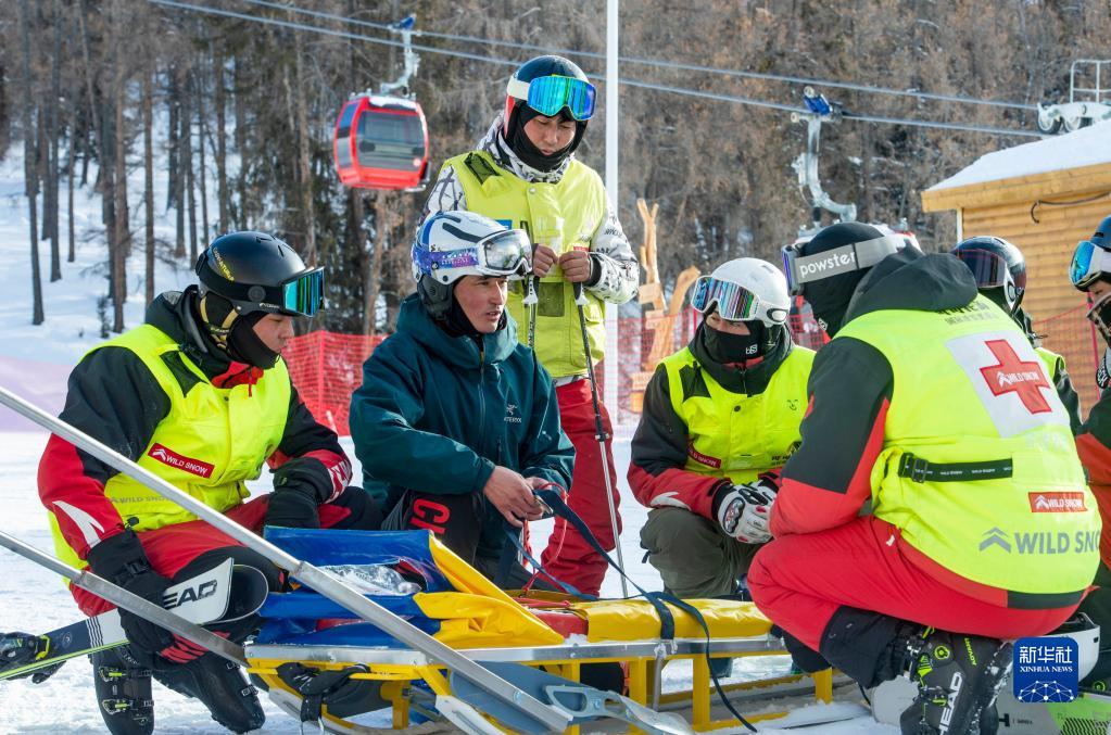 在新疆阿勒泰地區富蘊縣可可托?;﹫觯I依爾別克·赤合斯(左二)與雪場救援隊同事一起進行安全救援演練(2022年12月26日攝)。