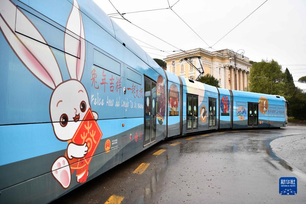 當日,兔年春節主題電車亮相意大利首都羅馬,慶祝即將到來的中國農歷新年。