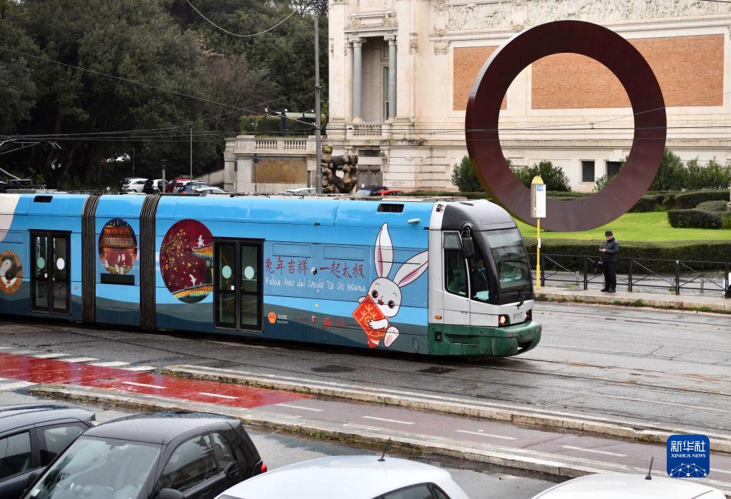 當(dāng)日,兔年春節(jié)主題電車亮相意大利首都羅馬,慶祝即將到來的中國農(nóng)歷新年。