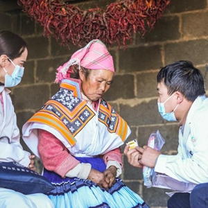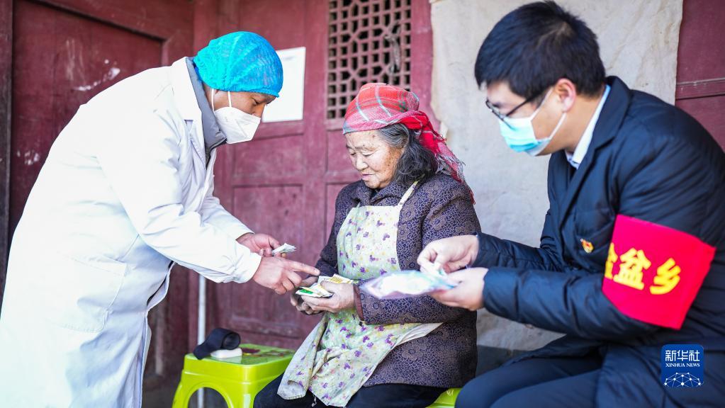 醫務工作者和黨員先鋒隊隊員(右)到六盤水市鐘山區金盆苗族彝族鄉營盤村村民家中巡診送藥(1月6日攝)。