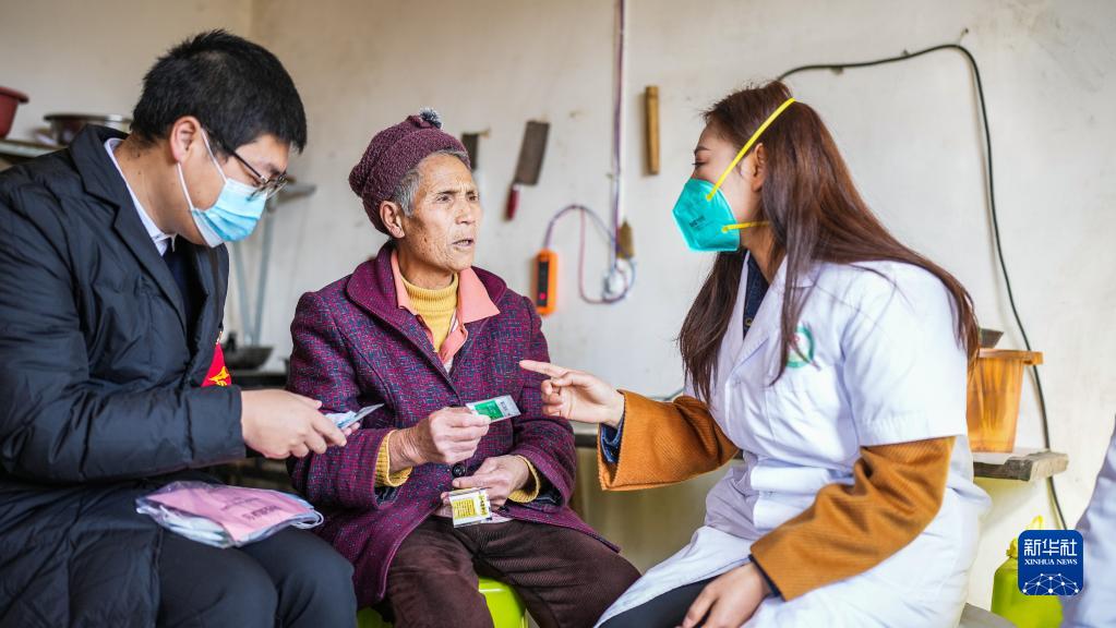 醫務工作者和黨員先鋒隊隊員(左)到六盤水市鐘山區金盆苗族彝族鄉營盤村村民家中巡診送藥(1月6日攝)。