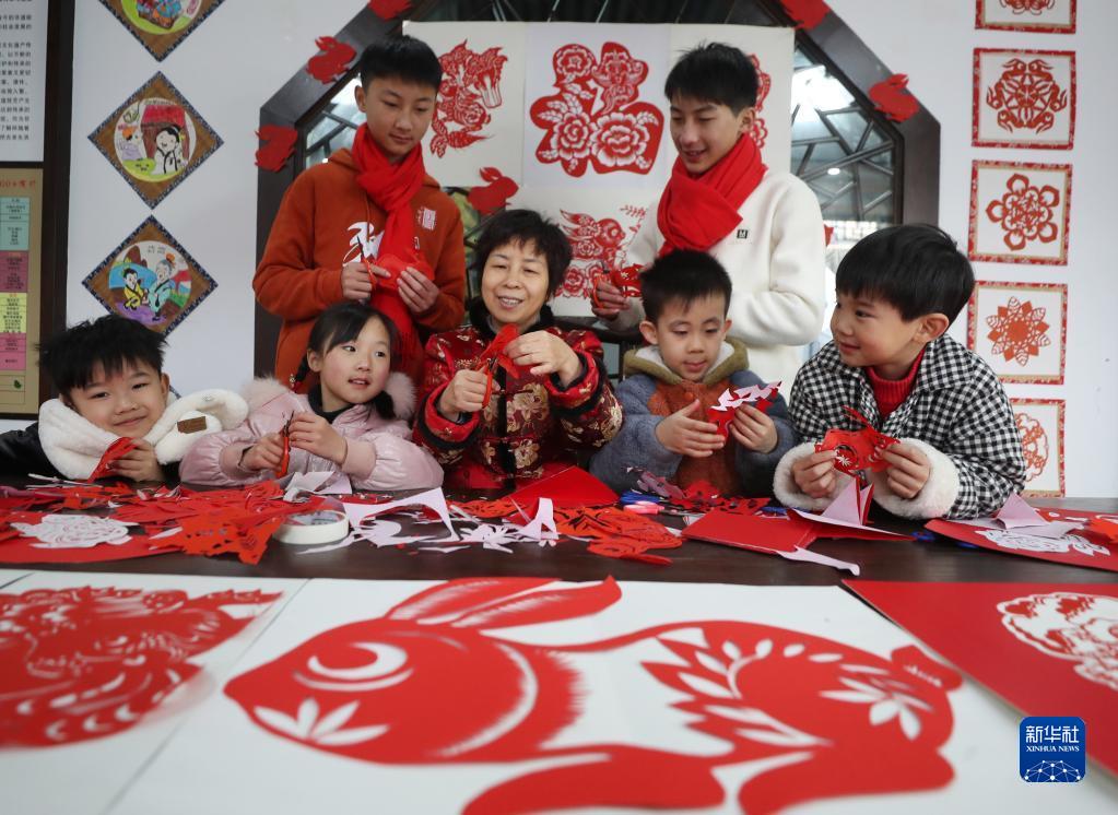 1月18日,在湖南省衡陽市衡東縣文化館剪紙非遺傳習所,衡東縣剪紙非遺傳承人廖哲定(中)在指導小朋友們剪兔子。