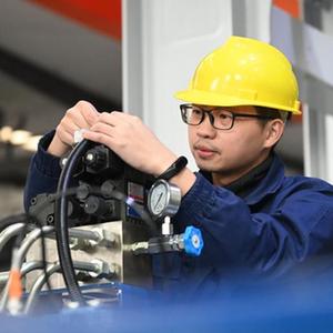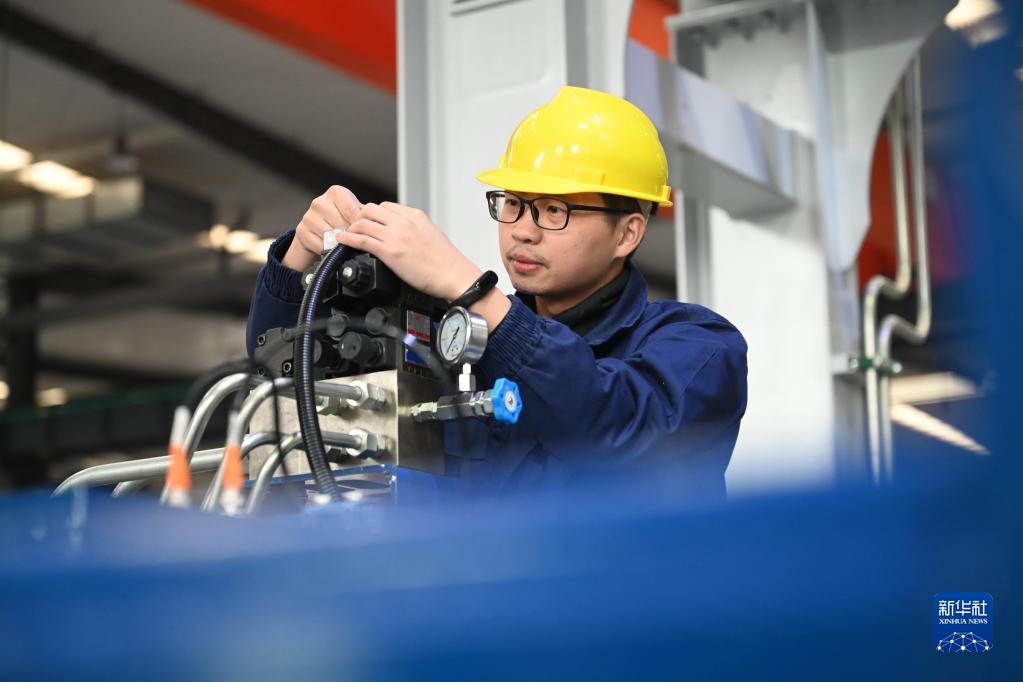 福建泉工股份有限公司工作人員在安裝銷往海外的全自動砌塊成型機(2022年12月14日攝)。