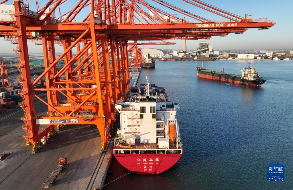 1月15日,一艘輪船靠泊在唐山港京唐港區(qū)集裝箱碼頭(無人機(jī)照片)。