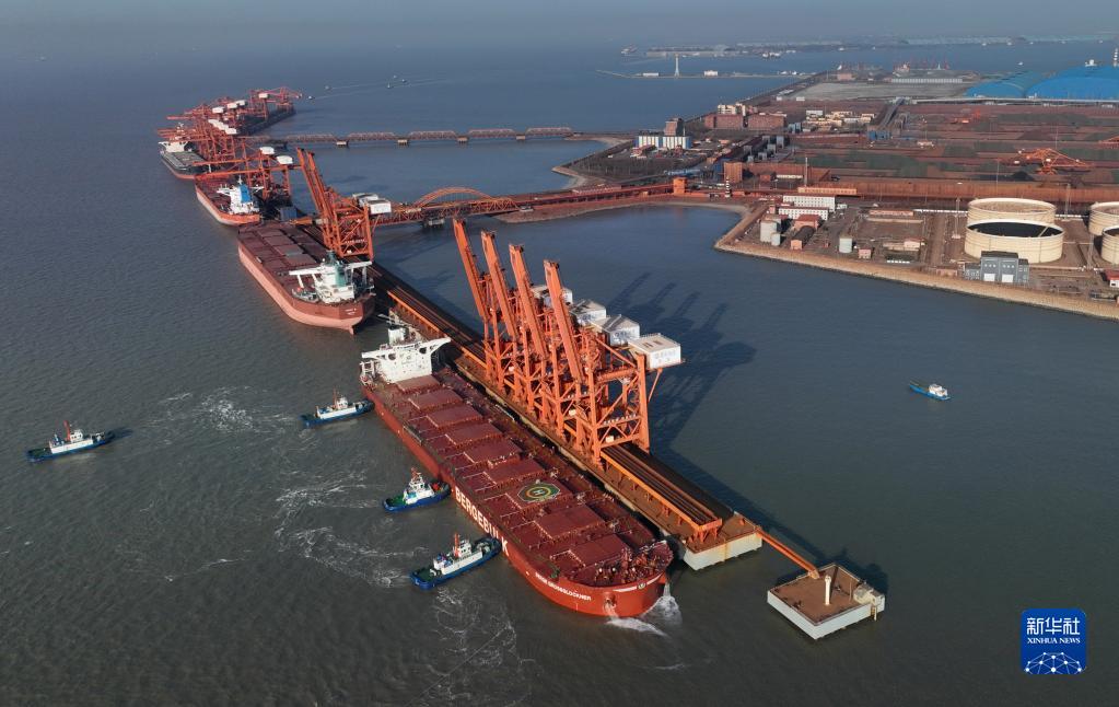 1月18日,一艘輪船在拖輪的協(xié)助下向唐山港曹妃甸港區(qū)礦石碼頭靠泊(無人機照片)。