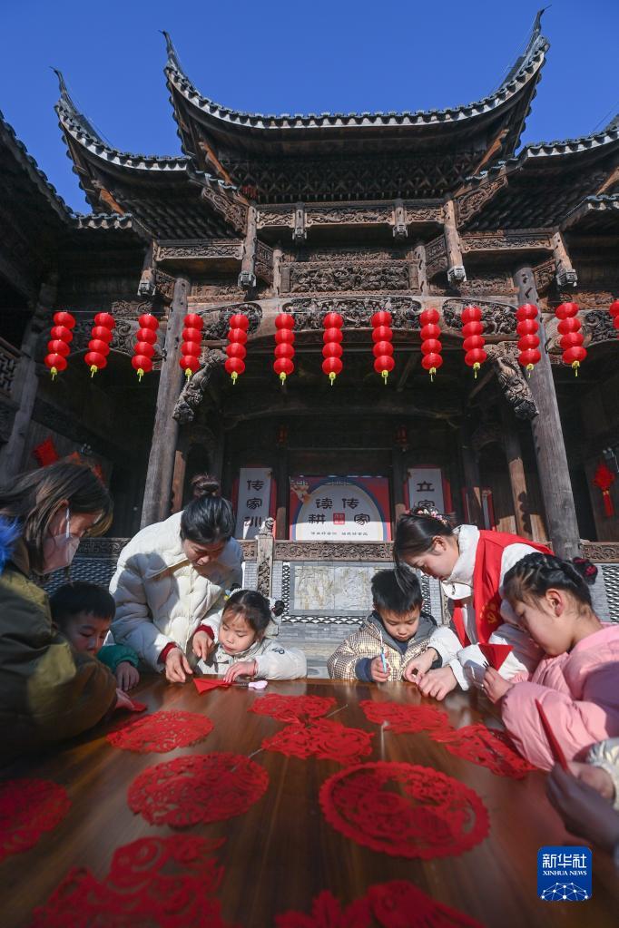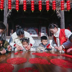 1月18日,在長興縣李家巷石泉村的古建筑“百桌廳”內,孩子們在志愿者的帶領下學習剪紙。