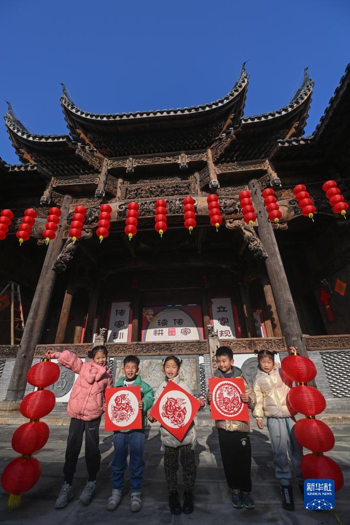 1月18日,在長興縣李家巷石泉村的古建筑“百桌廳”內,孩子們在展示各式各樣的兔年剪紙。